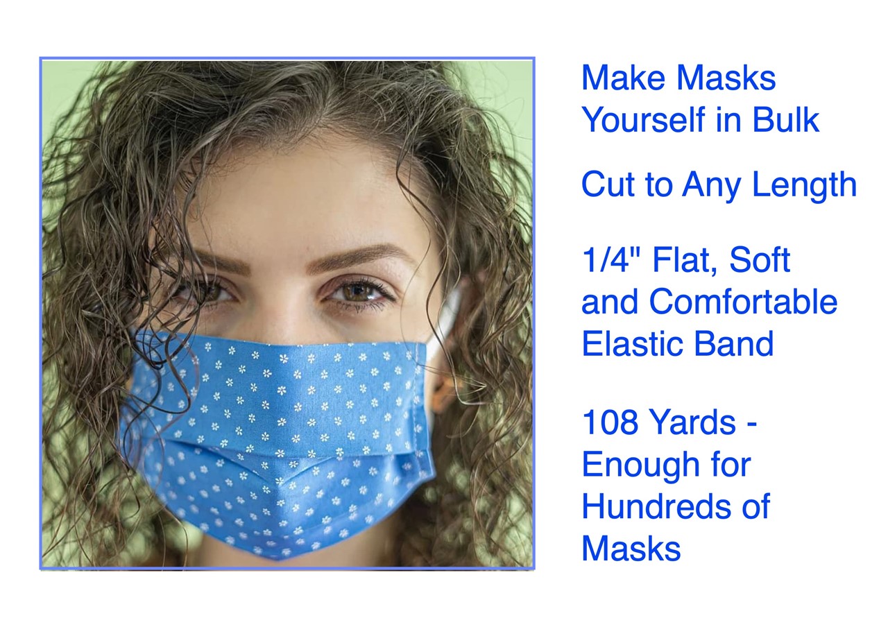 Availability Elastic Bands for Sewing COVID Masks COVID Mask Elastic Band - 6mm Wide (1/4 inch Wide) - 108 Yards Long in a Spool of Flat Elastic Cord. Email a friend Question about product? Add to compare list Add to wishlist Details Braided elastic band for sewing masks and craft products. 6mm wide ( 1/4 inch wide ). 108 yards long (100 meters) . Premium Quality - This material is made from premium quality woven polyester fabric covering a rubber fiber. Durable, mold resistant and machine washable. Soft and Comfortable - Soft texture and elasticity won't hurt your ears. The 1/4 elastic can be cut to a comfortable length. Many Uses - In addition to be great elastic for masks, can be used to sew pants, sportswear, hats, socks and shirts. Also great for kids crafts and DIY craft products. Elastic by the Yard - This spool of 108 yards (100 meters) of 1/4 inch elastic for sewing allows the sewing of many masks. Cut to any length easily with scissors.